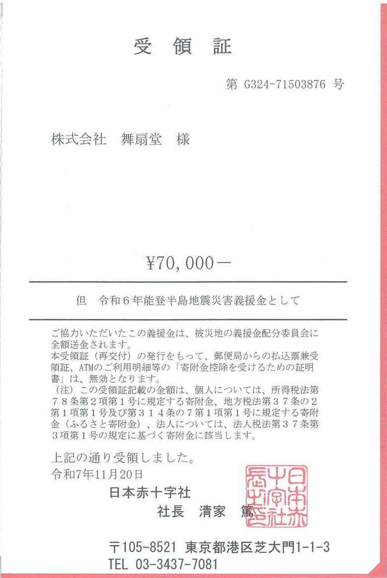 舞扇堂直営店の店頭にて皆さまにご協力いただいております募金につきまして、2025年9月1日~2025年10月末日にて一旦集計をし「日本赤十字社(令和6年能登半島地震災害義援金)」へ寄付をいたしました。